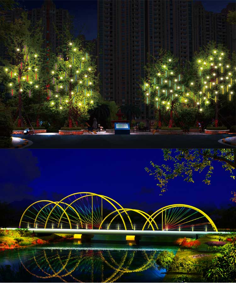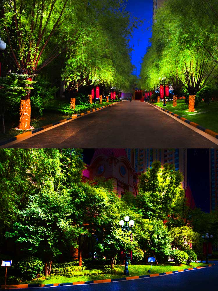 帝景小區廣場亮化,帝景地處未央路地理位置優越,是西安市未央區太華北路的商業繁華地段,環境優美、交通便利。在繁華的城市中創造出一片公園亮點,色彩斑斕,冷暖結合,讓城市夜景的魅力得以顯現,提升綠色城市,低碳生活的城市形象的同時,也提高了使用舒適度和照明外在的景觀美感。