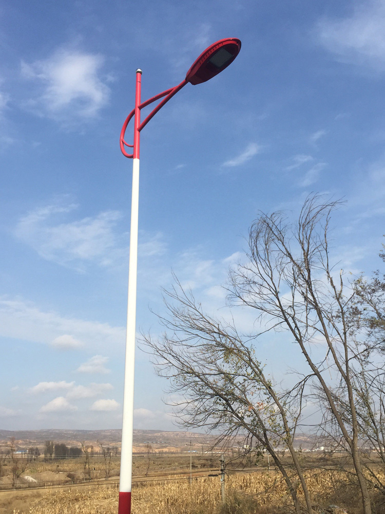 簡介—— 陜西榆林市橫山縣泗源溝村農村太陽能路燈工程,泗源溝村保存著較為完整的鄉(xiāng)土文化,地處黃土高原與毛烏素沙漠接壤處,北望遼闊的沙漠,西靠雄厚的黃土高原之山脈,東臨著名的無定河。村莊采用的是我蘭光照明的6米高市電路燈,顏色為紅色為主,為村莊增添了不少喜慶氣氛。